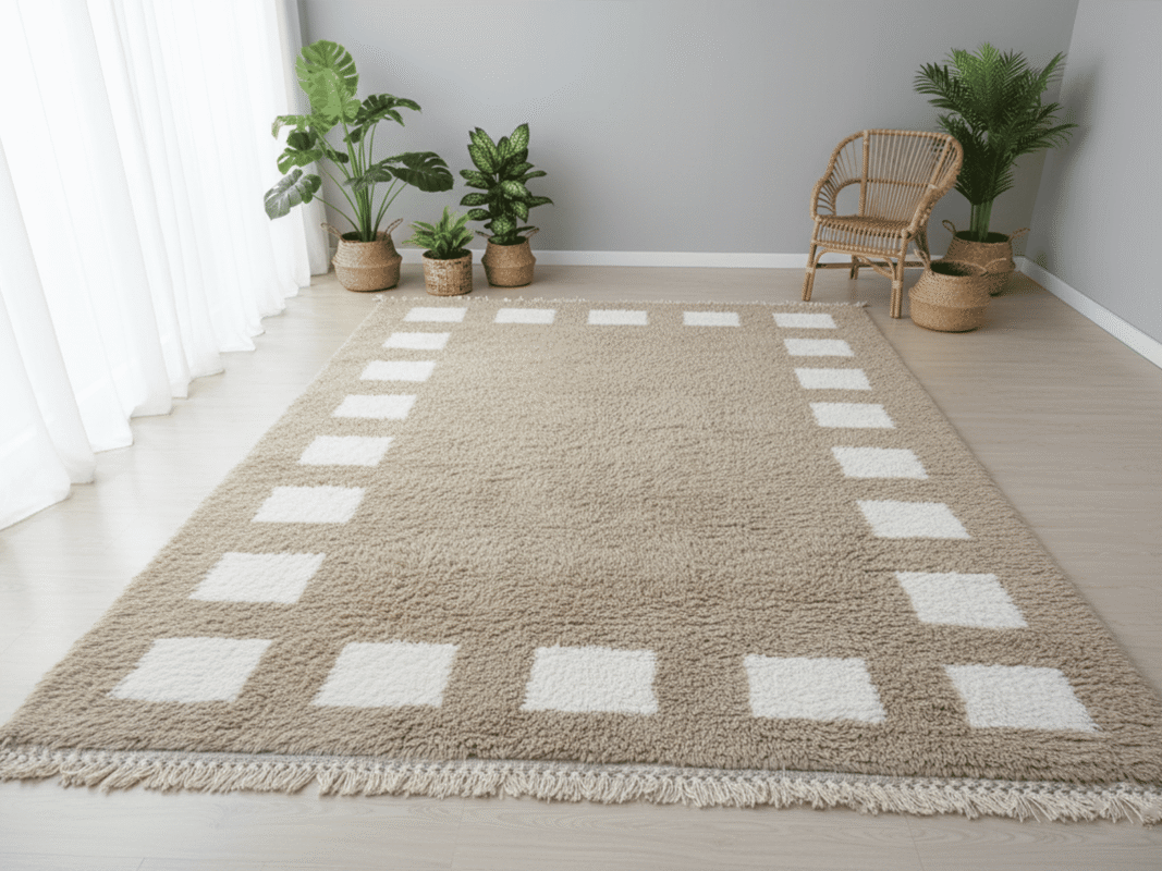 Beni Ourain Moroccan Rectangular Area Rug – Minimal Square Border – Handmade Wool