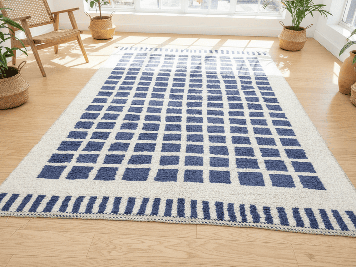 The blue grid motif is evenly spaced and visually balanced, offering structure without heaviness. The natural white background keeps the rug light and adaptable across different living spaces.