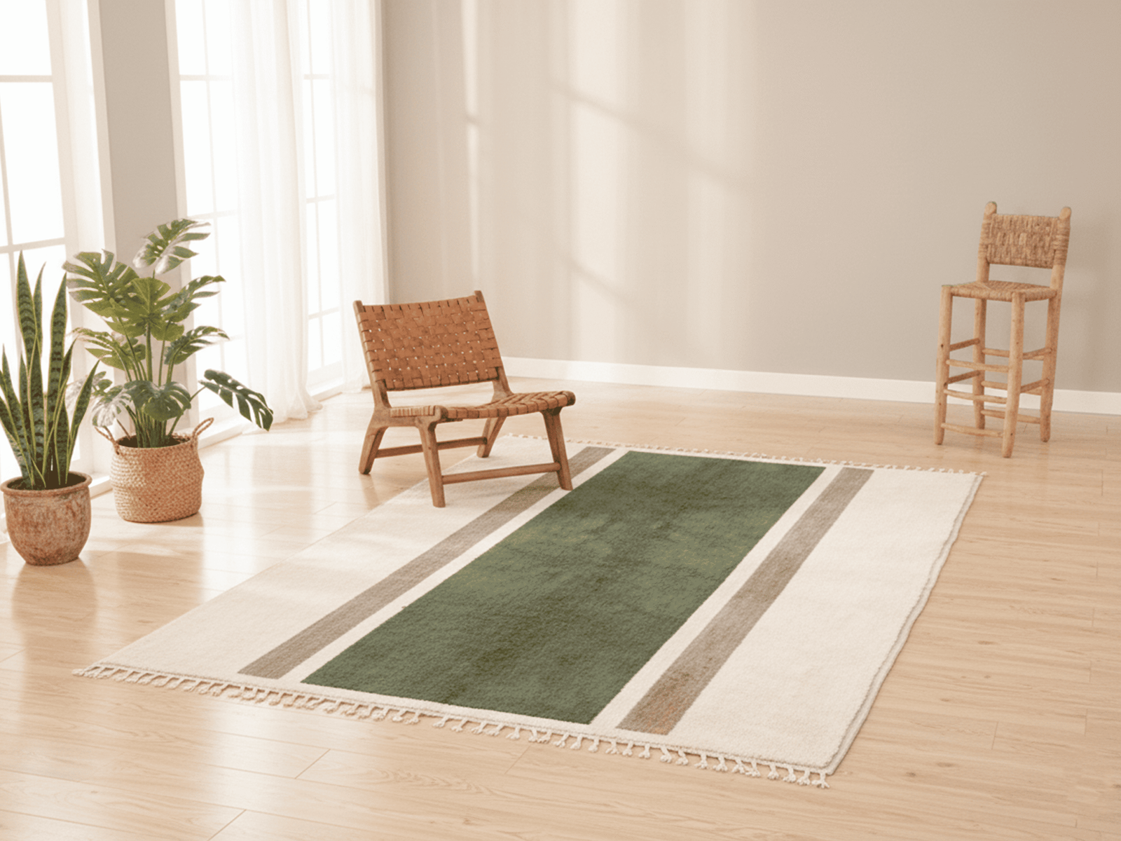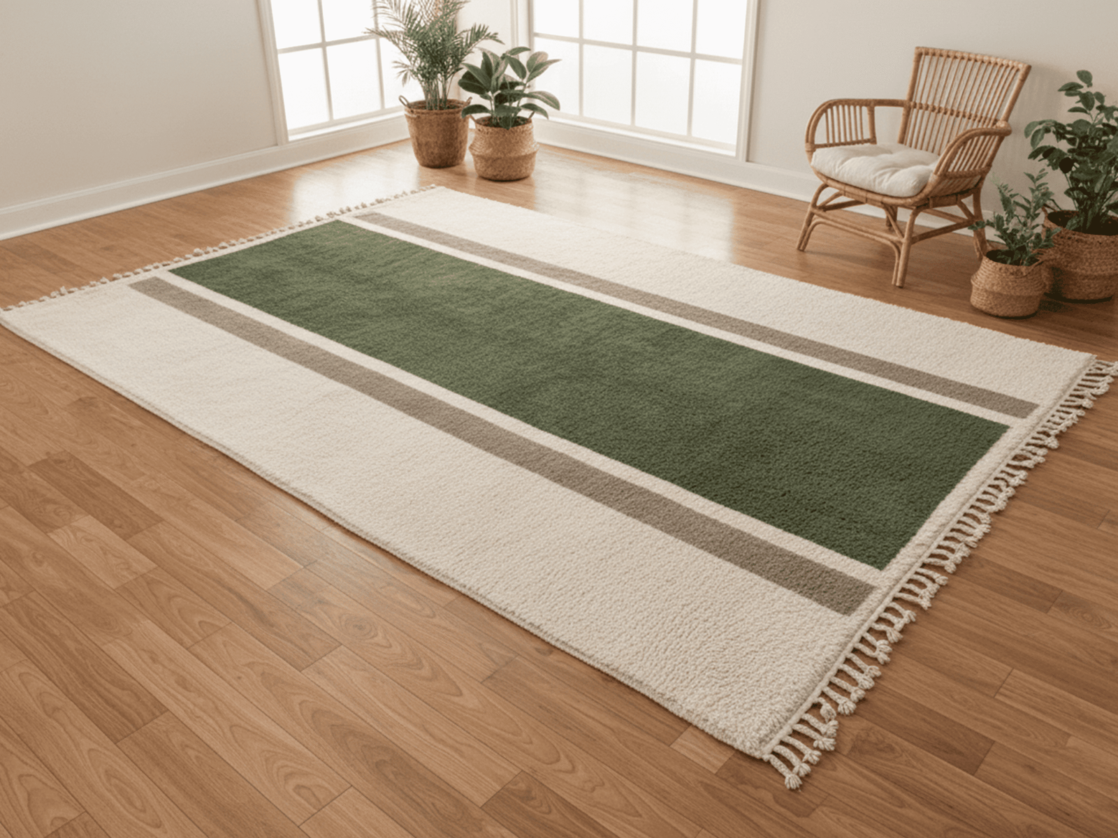 The design is defined by a central Green field framed by subtle Beige and Brown stripes, creating a clean and architectural layout. The pattern is intentionally restrained, allowing texture and proportion to take precedence.