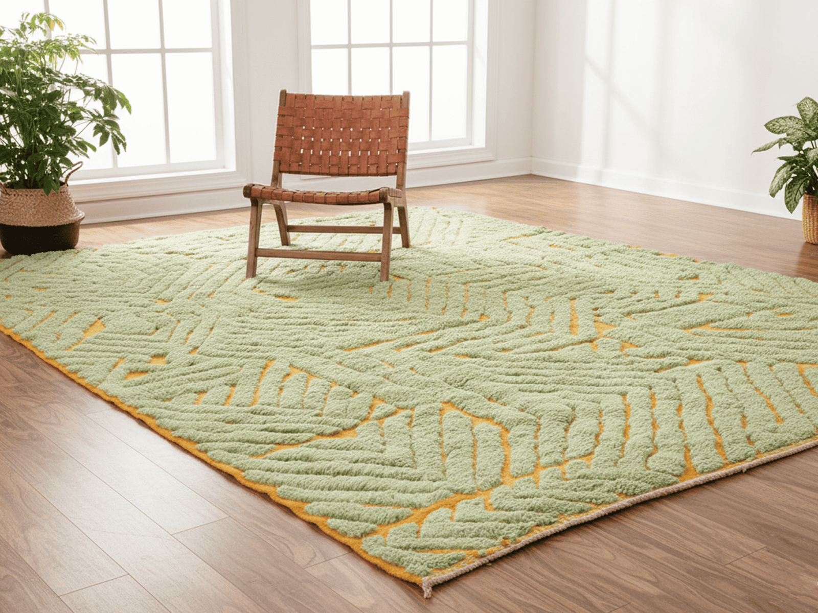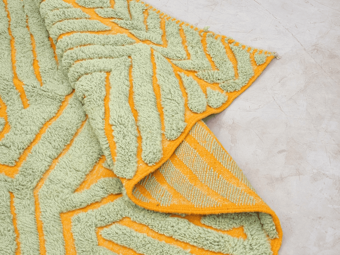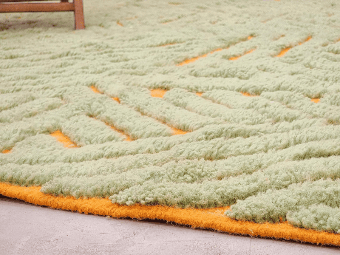 This Rectangular Area Rug features a bold abstract geometric composition with raised, sculptural lines. The color palette combines Green as the dominant tone with warm Orange accents, creating a dynamic visual contrast. The textured, high-pile surface gives the rug depth and movement, making it ideal for modern, minimalist, Scandinavian, and boho interiors.
