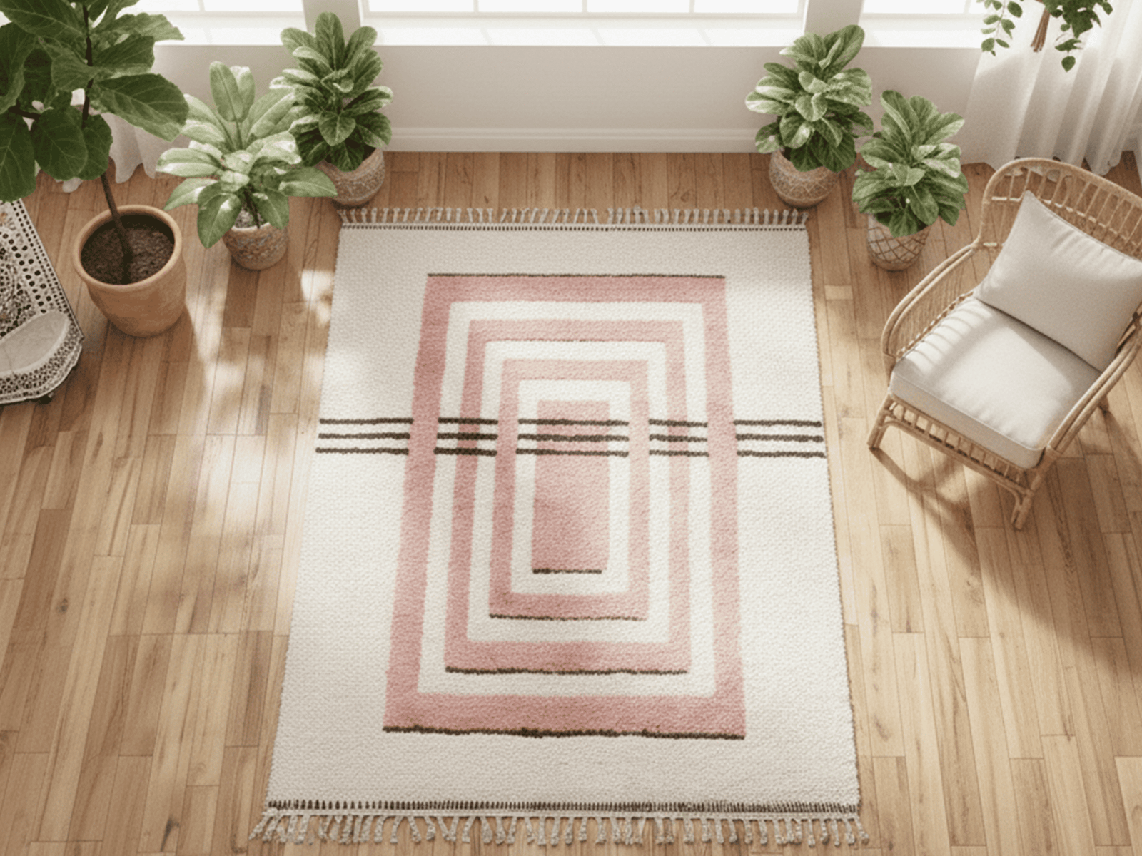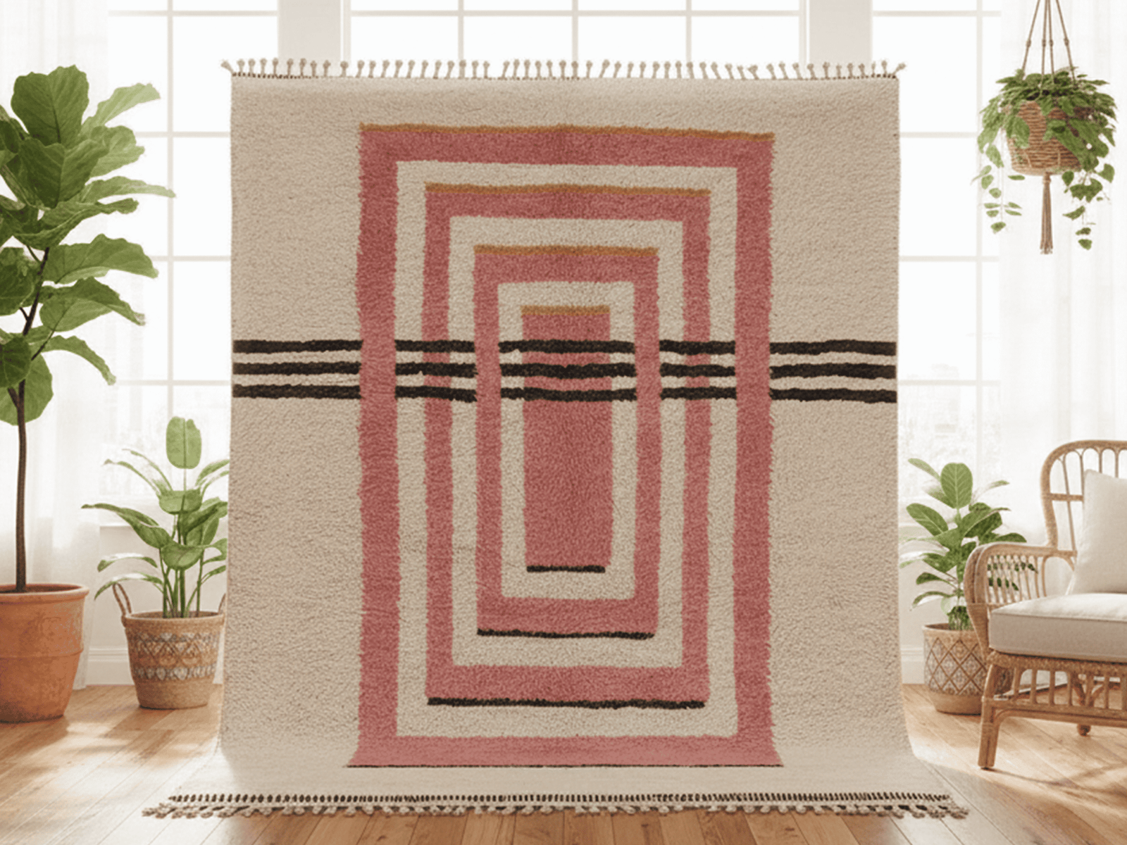 This Rectangular Area Rug is defined by a centered composition of nested geometric rectangles, intersected by horizontal striped lines. The base tone is Beige, enriched with layered Pink forms, subtle Yellow accents, and grounding Black stripes. The composition feels architectural and calm, with a strong sense of symmetry and depth. Its plush, even pile enhances the softness of the design, making it ideal for modern, minimalist, Scandinavian, and curated boho interiors.
