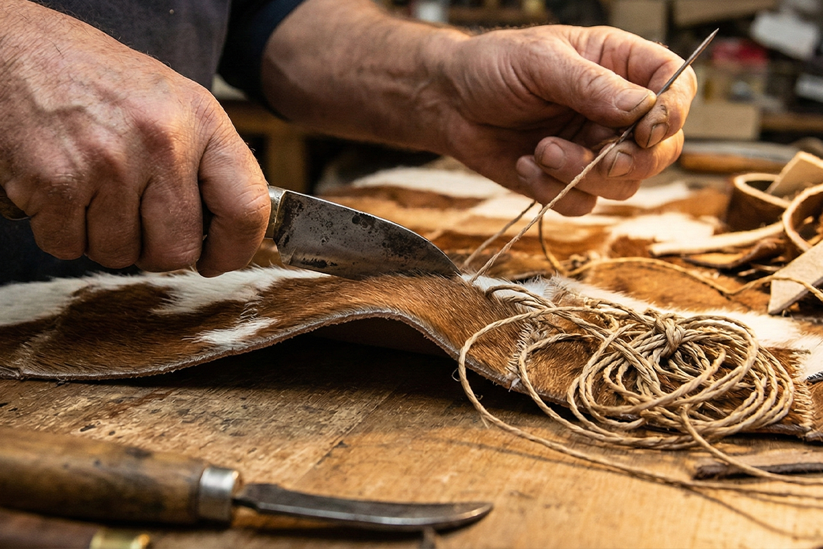 The hides are tanned using natural pigments, cut by hand, and transformed through hundreds of slow, deliberate, ancestral knots.